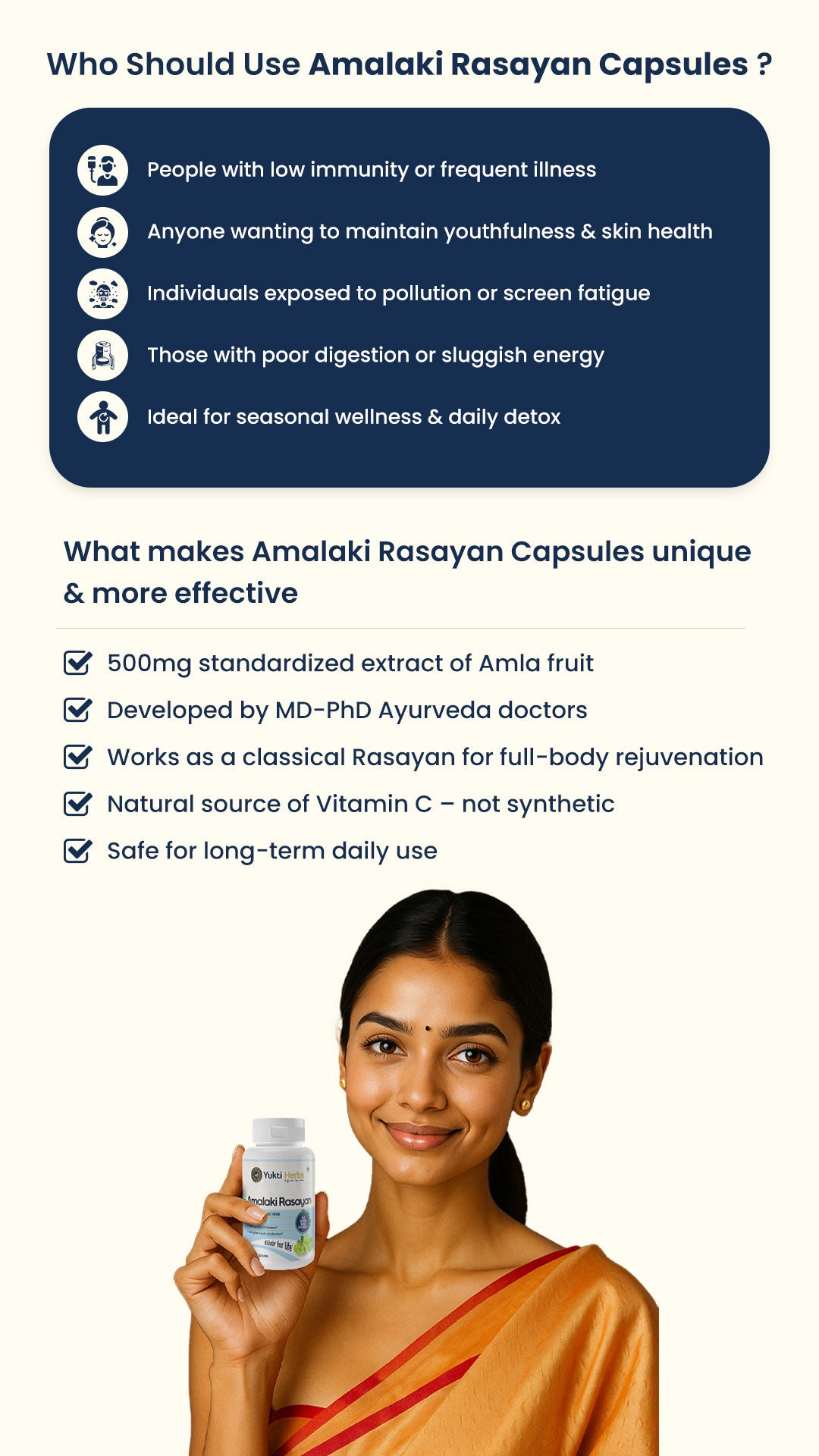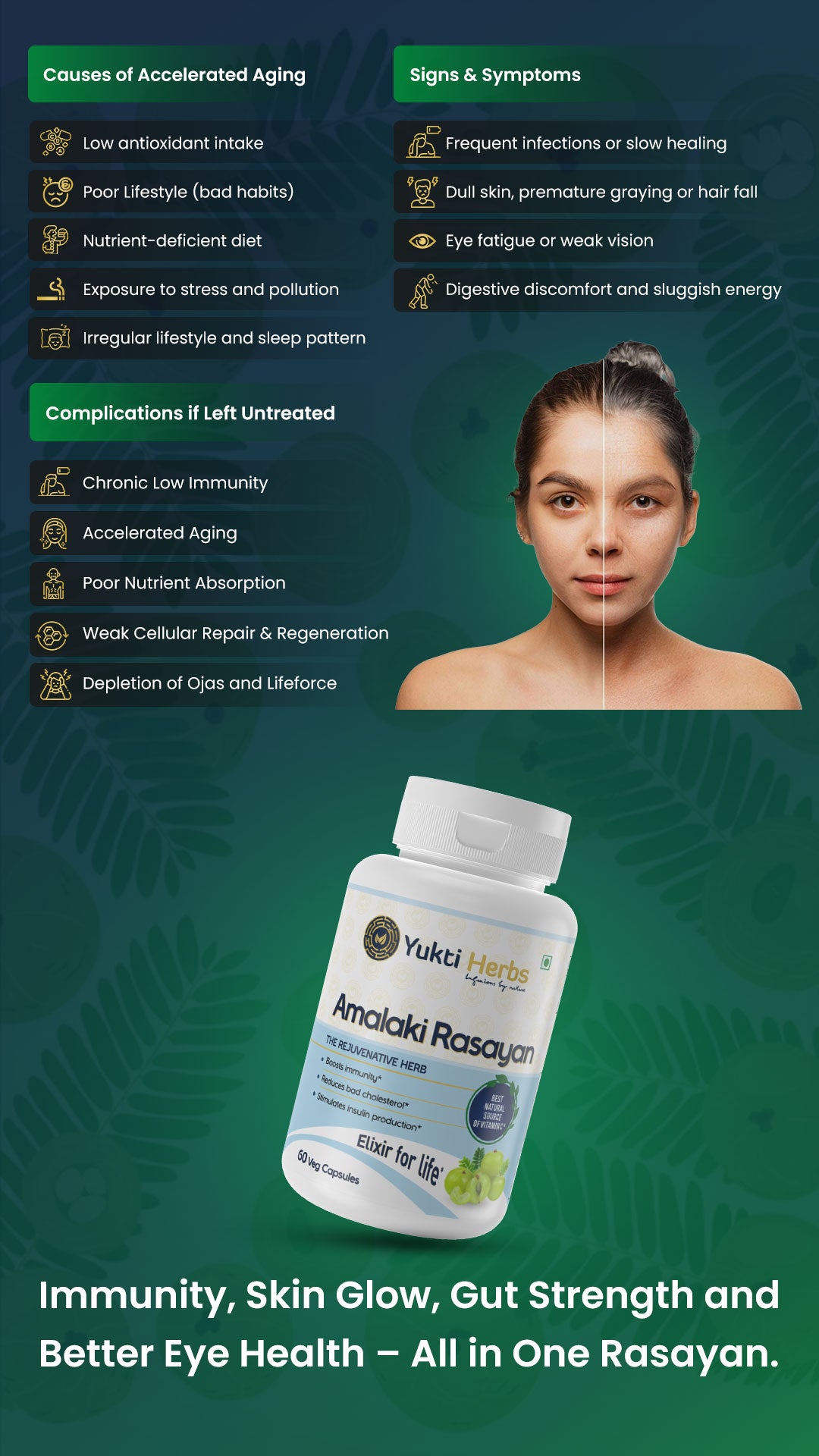 Yukti Herbs Amalaki Rasayan capsules contain 500mg standardized extract of Amla (Indian gooseberry fruits) processed as per classical Rasayan techniques of Ayurveda. Amalaki Rasayan is basically prepared by mixing raw Amla powder with Amla Juice, dried and grounded 100 times. This enhances their rejuvenating properties, immunity-boosting, and anti-aging effects beyond basic Amla powders or tablets.