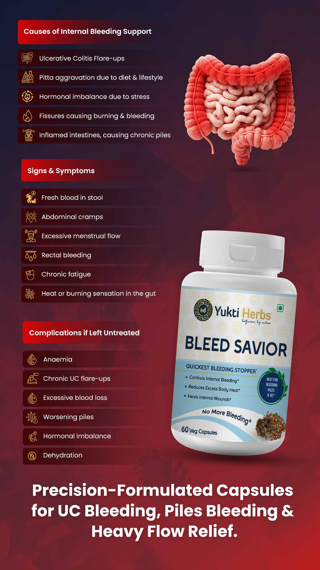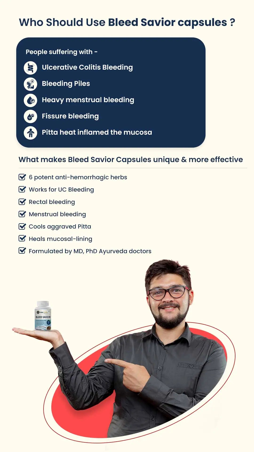 Bleed Savior is an Ayurvedic anti‑hemorrhagic formulation designed to reduce UC bleeding, bleeding piles, fissure bleeding and heavy menstrual flow. Its herbs strengthen mucosa, cool Pitta heat, tighten tissues and naturally slow internal blood loss due to cooling & astringent properties of the ingredients added in this formulation.