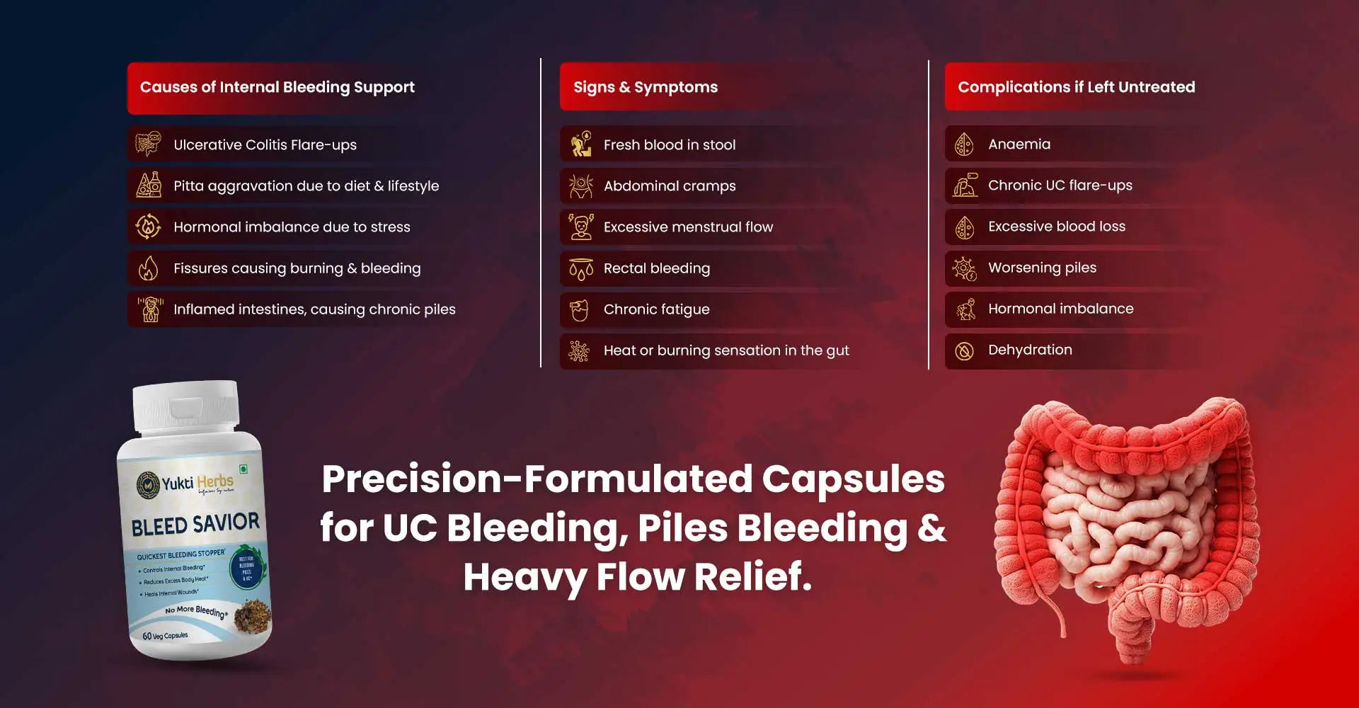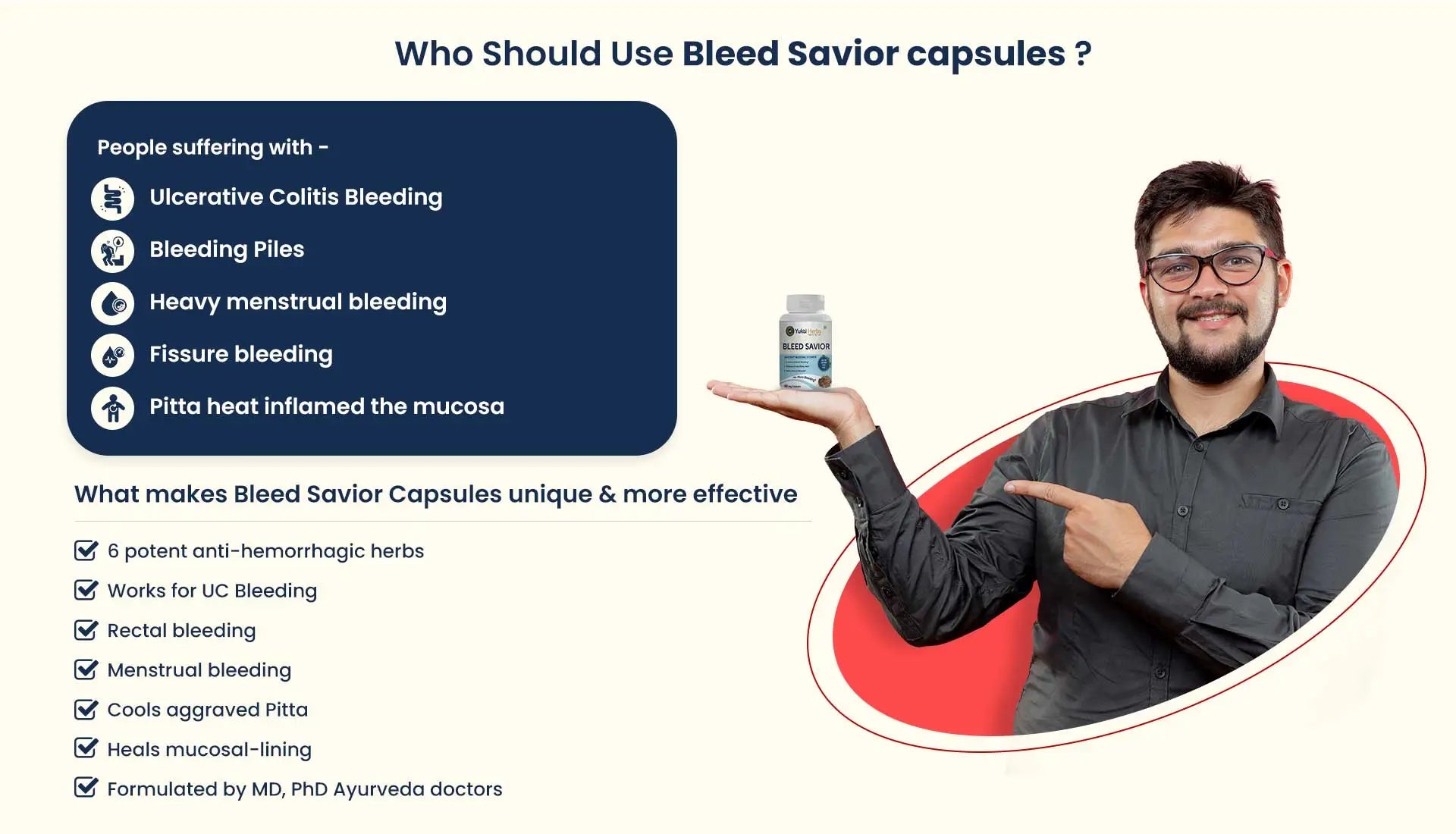 Yes, Bleed Savior supports UC patients by cooling intestinal Pitta, healing ulcers, reducing fresh blood in stool and strengthening weak colon lining. Herbs like Lajjalu, Mochras and Keharwa Pishti offer reliable Ayurvedic support for UC bleeding management. It is very effective in UC patients suffering from frequent flare-ups despite modern drugs.