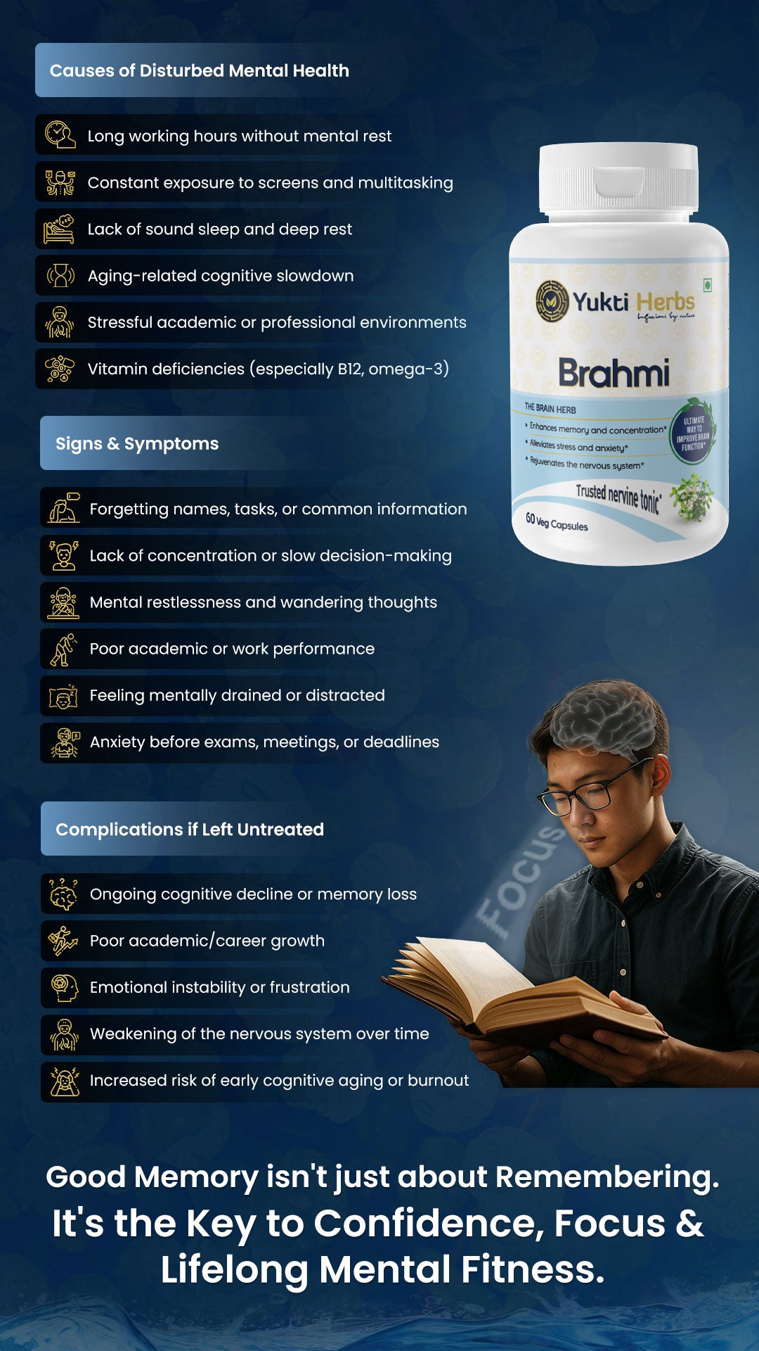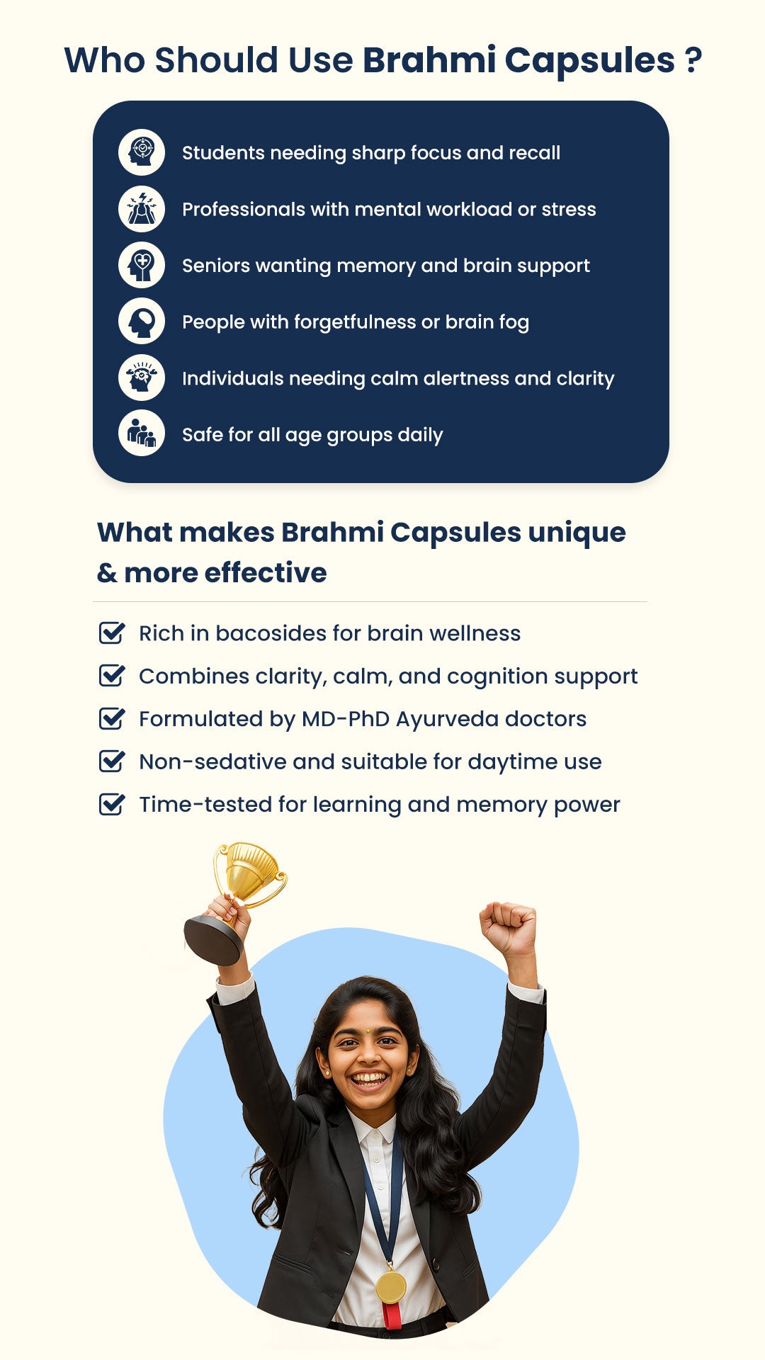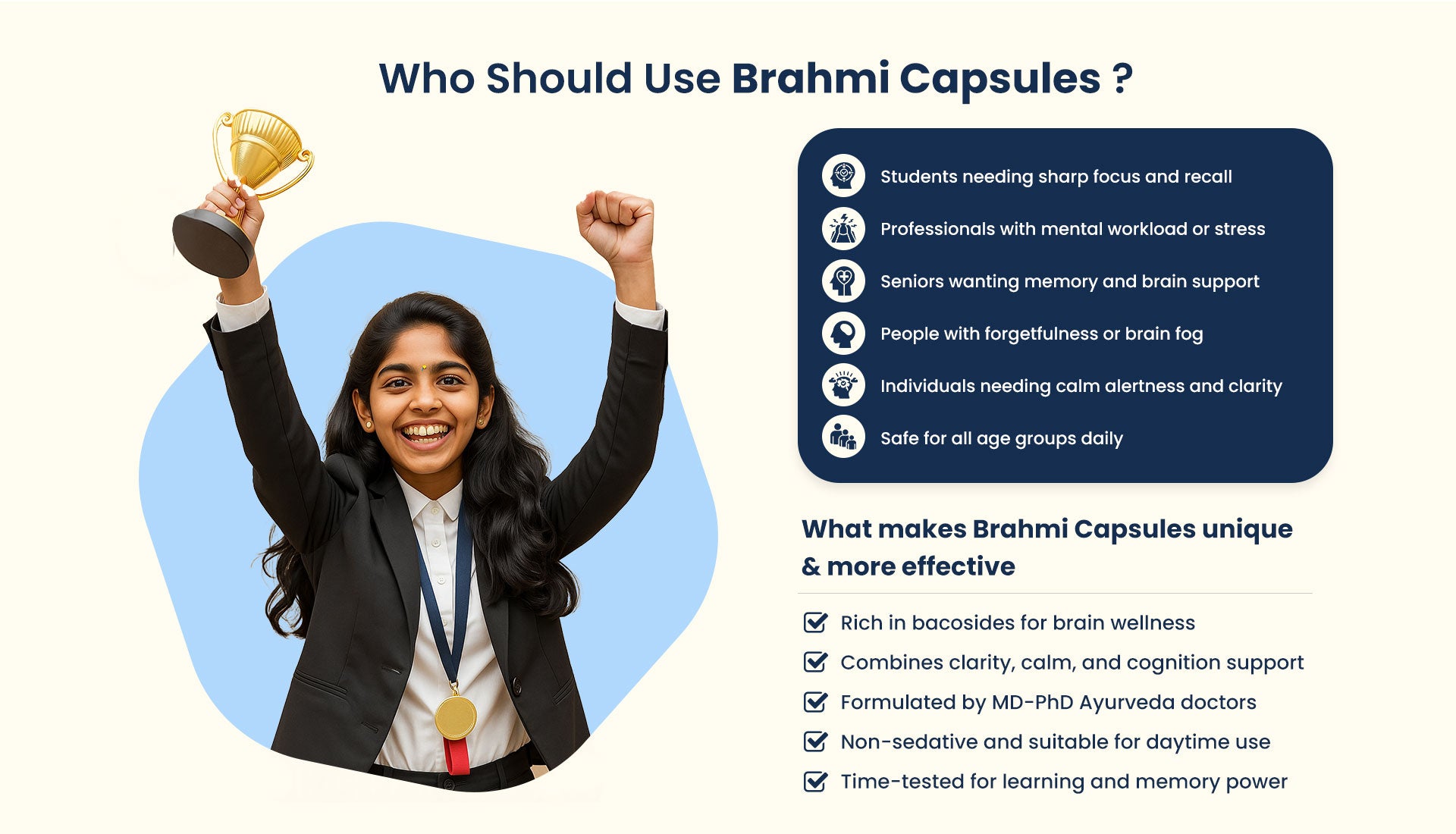 Follow a regular sleep schedule, stay hydrated, and limit screen exposure. Avoid heavy junk food, excess caffeine, and late-night mental strain. For best results, pair Brahmi with light yoga or pranayama to enhance mental clarity and focus.